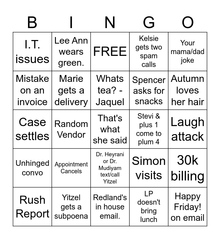 This bingo card has a free space and 24 words: Appointment Cancels, Yitzel gets a subpoena, Whats tea? - Jaquel, Rush Report, Your mama/dad joke, I.T. issues, Mistake on an invoice, Lee Ann wears green., Stevi & plus 1 come to plum 4, Dr. Heyrani or Dr. Mudiyam text/call Yitzel, Spencer asks for snacks, Case settles, Simon visits, 30k billing, Marie gets a delivery, LP doesn't bring lunch, Laugh attack, FREE, Autumn loves her hair, Random Vendor, Happy Friday! on email, Unhinged convo, Kelsie gets two spam calls and Redland's in house email..