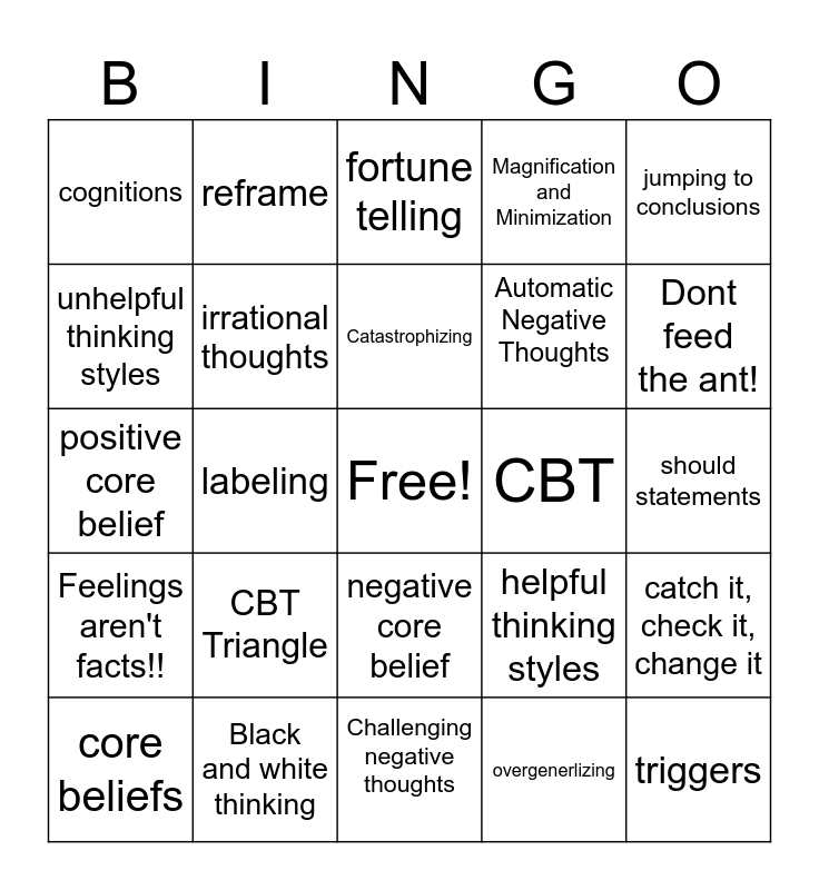 This bingo card has a free space and 24 words: CBT Triangle, Black and white thinking, Catastrophizing, core beliefs, jumping to conclusions, cognitions, unhelpful thinking styles, reframe, CBT, negative core belief, Automatic Negative Thoughts, positive core belief, helpful thinking styles, catch it, check it, change it, irrational thoughts, overgenerlizing, should statements, fortune telling, Dont feed the ant!, labeling, triggers, Feelings aren't facts!!, Magnification and Minimization and Challenging negative thoughts.
