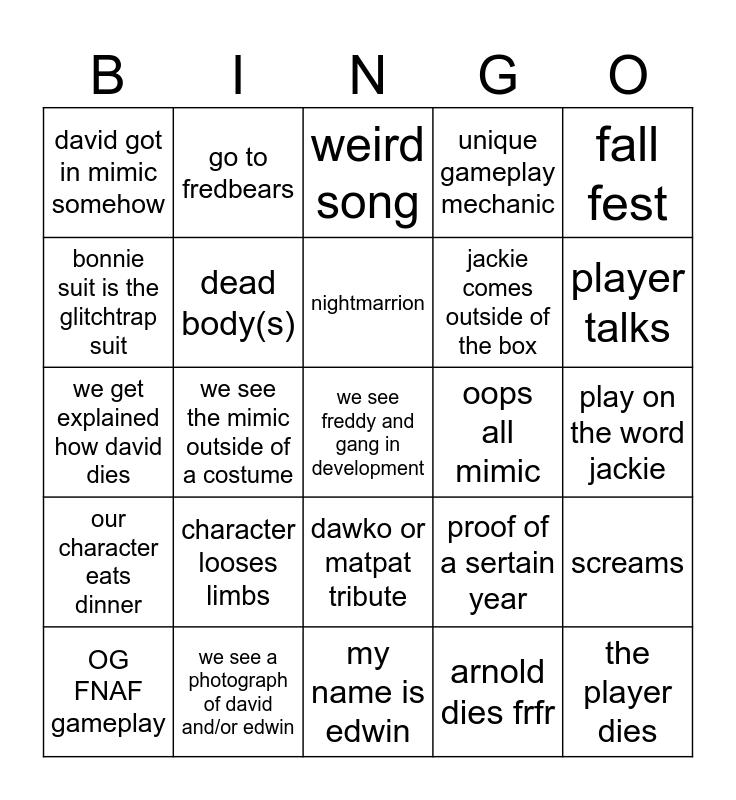 This bingo card has 25 words: character looses limbs, my name is edwin, nightmarrion, OG FNAF gameplay, fall fest, david got in mimic somehow, bonnie suit is the glitchtrap suit, go to fredbears, oops all mimic, dawko or matpat tribute, jackie comes outside of the box, we get explained how david dies, proof of a sertain year, screams, dead body(s), the player dies, play on the word jackie, weird song, player talks, we see the mimic outside of a costume, we see freddy and gang in development, we see a photograph of david and/or edwin, our character eats dinner, unique gameplay mechanic and arnold dies frfr.