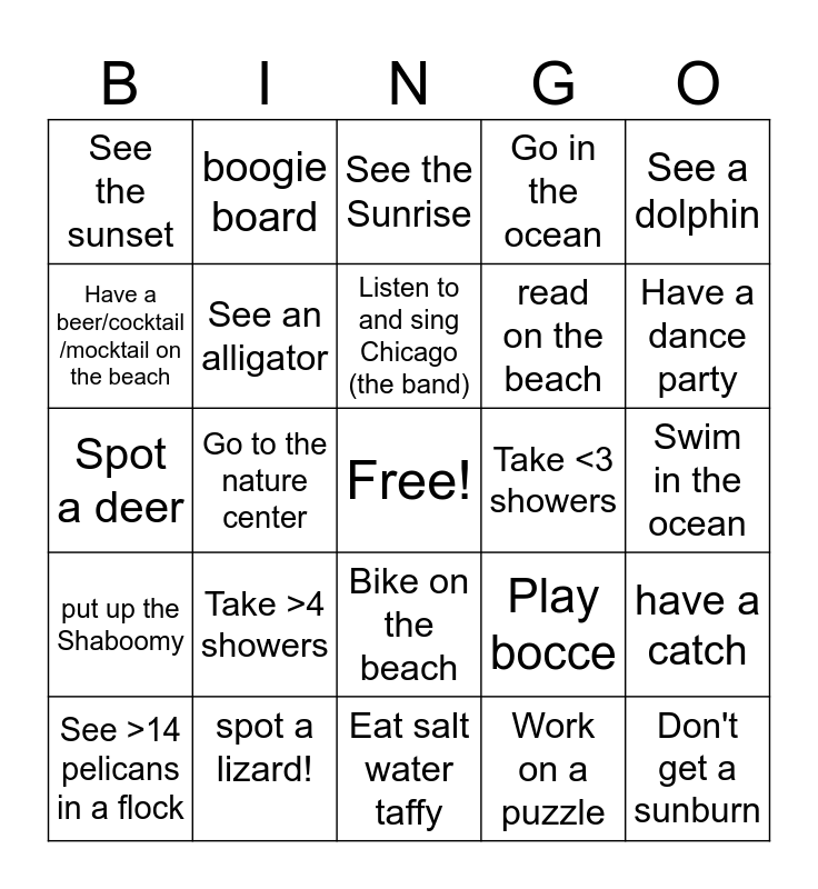This bingo card has a free space and 29 words: See >14 pelicans in a flock, Bike on the road, Go to the nature center, Go to the beach at night, See the sunset, See the Sunrise, See an alligator, Take >4 showers, Take <3 showers, spot a lizard!, Swim in the ocean, Don't get a sunburn, Eat salt water taffy, Work on a puzzle, Have a dance party, Build a sand castle with a tunnel, Bike on the beach, put up the Shaboomy, See a dolphin, Spot a deer, Play bocce, Find a special shell, read on the beach, Have a beer/cocktail /mocktail on the beach, Go in the ocean, boogie board, have a catch, Listen to and sing Chicago (the band) and Play a card game.
