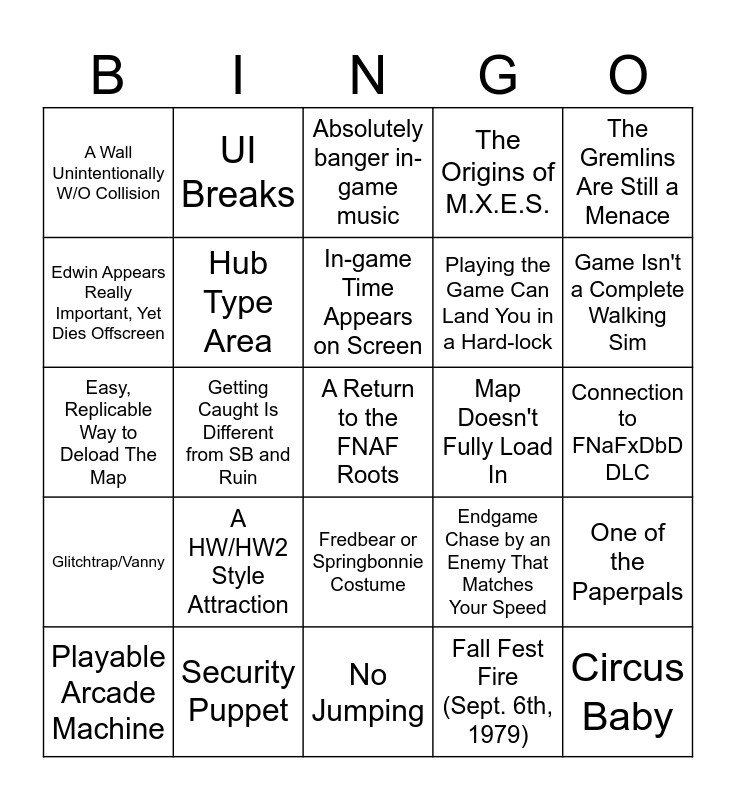 This bingo card has 25 words: A HW/HW2 Style Attraction, No Jumping, In-game Time Appears on Screen, Playable Arcade Machine, The Gremlins Are Still a Menace, A Wall Unintentionally W/O Collision, Edwin Appears Really Important, Yet Dies Offscreen, UI Breaks, Map Doesn't Fully Load In, Fredbear or Springbonnie Costume, Playing the Game Can Land You in a Hard-lock, Easy, Replicable Way to Deload The Map, Endgame Chase by an Enemy That Matches Your Speed, One of the Paperpals, Hub Type Area, Circus Baby, Connection to FNaFxDbD DLC, Absolutely banger in-game music, Game Isn't a Complete Walking Sim, Getting Caught Is Different from SB and Ruin, A Return to the FNAF Roots, Security Puppet, Glitchtrap/Vanny, The Origins of M.X.E.S. and Fall Fest Fire (Sept. 6th, 1979).