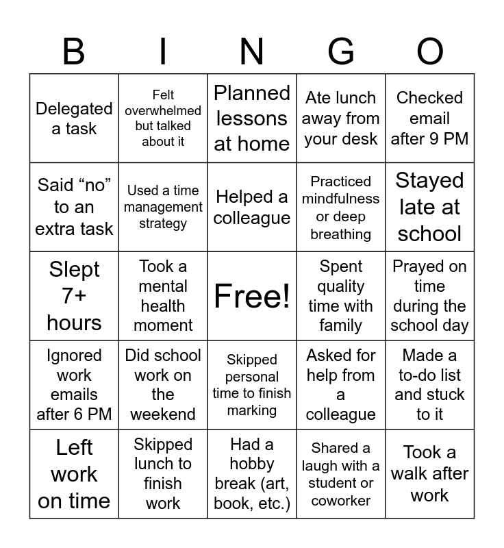 This bingo card has a free space and 25 words: Did school work on the weekend, Had a hobby break (art, book, etc.), Helped a colleague, Left work on time, Checked email after 9 PM, Delegated a task, Said “no” to an extra task, Felt overwhelmed but talked about it, Spent quality time with family, Skipped personal time to finish marking, Practiced mindfulness or deep breathing, Slept 7+ hours, Asked for help from a colleague, Made a to-do list and stuck to it, Used a time management strategy, Took work home but didn’t finish it, Prayed on time during the school day, Planned lessons at home, Stayed late at school, Took a mental health moment, Took a walk after work, Skipped lunch to finish work, Ignored work emails after 6 PM, Ate lunch away from your desk and Shared a laugh with a student or coworker.