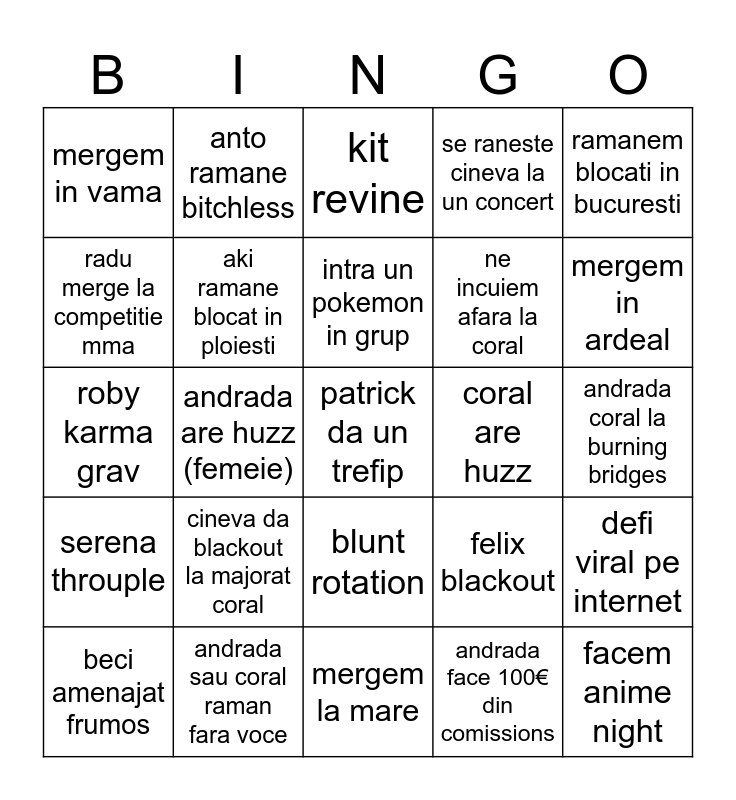 This bingo card has 25 words: serena throuple, andrada sau coral raman fara voce, patrick da un trefip, andrada face 100€ din comissions, ramanem blocati in bucuresti, mergem in vama, anto ramane bitchless, kit revine, coral are huzz, defi viral pe internet, radu merge la competitie mma, aki ramane blocat in ploiesti, mergem la mare, felix blackout, mergem in ardeal, beci amenajat frumos, andrada are huzz (femeie), intra un pokemon in grup, ne incuiem afara la coral, andrada coral la burning bridges, roby karma grav, cineva da blackout la majorat coral, blunt rotation, se raneste cineva la un concert and facem anime night.
