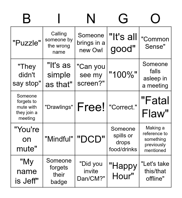 This bingo card has a free space and 31 words: "Did you invite Dan/CM?", When people are twinning, "Drawlings", Triggered Rant, "Puzzle", Someone brings in a new Owl, "It's as simple as that", Someone spills or drops food/drinks, "Correct.", "Happy Hour", "Fatal Flaw", "Let's take this/that offline", "I don't disagree", "Go Bye-bye", Someone falls asleep in a meeting, Tootsie, Making a reference to something previously mentioned, "Mindful", "You're on mute", "DCD", "Common Sense", "Parts & Pieces / Pieces & Parts", "My name is Jeff", Calling someone by the wrong name, "100%", "They didn't say stop", "It's all good", Someone forgets to mute with they join a meeting, Someone forgets their badge, "Can you see my screen?" and Staff meeting ends early.