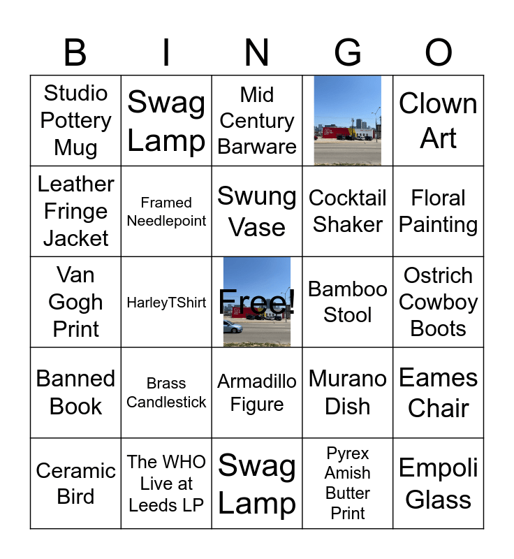 This bingo card has 1 images, a free space and 23 words: Brass Candlestick, The WHO Live at Leeds LP, Swung Vase, Ceramic Bird, Clown Art, Studio Pottery Mug, Leather Fringe Jacket, Swag Lamp, Bamboo Stool, Armadillo Figure, Cocktail Shaker, Van Gogh Print, Murano Dish, Eames Chair, Framed Needlepoint, Pyrex Amish Butter Print, Ostrich Cowboy Boots, Mid Century Barware, Floral Painting, HarleyTShirt, Empoli Glass, Banned Book and Swag Lamp.