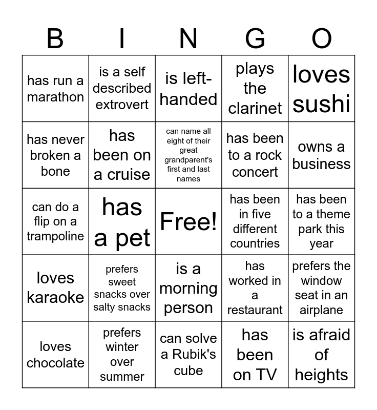 This bingo card has a free space and 29 words: loves chocolate, has been part of a band or choir, has a pet, has met a celebrity, has run a marathon, is left-handed, has been on a cruise, prefers sweet snacks over salty snacks, has been in five different countries, prefers winter over summer, has been to a theme park this year, is afraid of heights, can solve a Rubik's cube, has been on TV, owns a business, is a night owl, is a morning person, loves karaoke, loves sushi, can do a flip on a trampoline, has worked in a restaurant, has visited 5 national parks, has been to a rock concert, has never broken a bone, plays the clarinet, is a self described extrovert, prefers the window seat in an airplane, can name all eight of their great grandparent's first and last names and prefers barefeet over shoes.