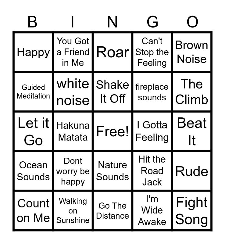This bingo card has a free space and 24 words: Dont worry be happy, Walking on Sunshine, Shake It Off, Count on Me, Brown Noise, Happy, Guided Meditation, You Got a Friend in Me, I Gotta Feeling, Nature Sounds, fireplace sounds, Let it Go, Hit the Road Jack, Rude, white noise, I'm Wide Awake, Beat It, Roar, The Climb, Hakuna Matata, Fight Song, Ocean Sounds, Can't Stop the Feeling and Go The Distance.