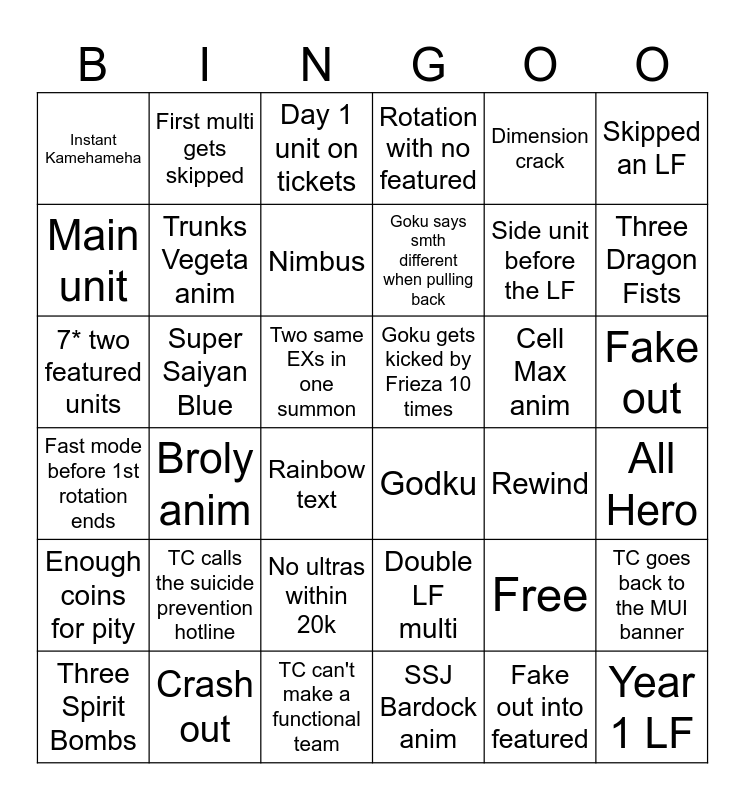This bingo card has 37 words: Free, Double LF multi, Fake out into featured, Main unit, Broly anim, Cell Max anim, Trunks Vegeta anim, SSJ Bardock anim, Dimension crack, Three Spirit Bombs, Three Dragon Fists, Rotation with no featured, 7* two featured units, Two same EXs in one summon, Skipped an LF, Goku gets kicked by Frieza 10 times, TC calls the suicide prevention hotline, Day 1 unit on tickets, Fake out, Super Saiyan Blue, Instant Kamehameha, Goku says smth different when pulling back, Rainbow text, Rewind, Crash out, All Hero, First multi gets skipped, TC can't make a functional team, TC goes back to the MUI banner, No ultras within 20k, Half the multi are sparkings, Godku, Side unit before the LF, Enough coins for pity, Fast mode before 1st rotation ends, Nimbus and Year 1 LF.