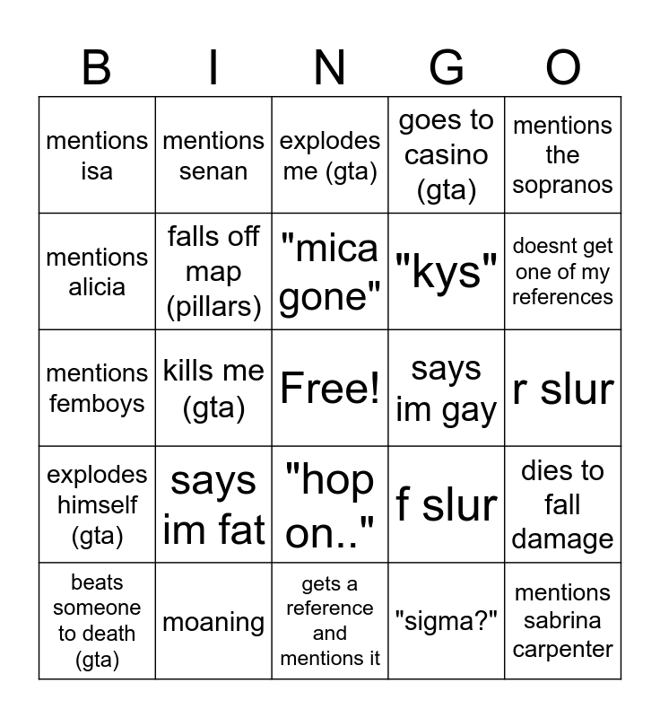 This bingo card has a free space and 26 words: "hop on..", "sigma?", "mica gone", moaning, mentions the sopranos, mentions isa, mentions alicia, mentions senan, r slur, f slur, "kys", mentions femboys, dies to fall damage, beats someone to death (gta), kills me (gta), kills me 3 times (gta), goes to casino (gta), explodes himself (gta), explodes me (gta), mentions sabrina carpenter, doesnt get one of my references, gets a reference and mentions it, says im gay, says im fat, falls off map (pillars) and mentions fortnite gift.