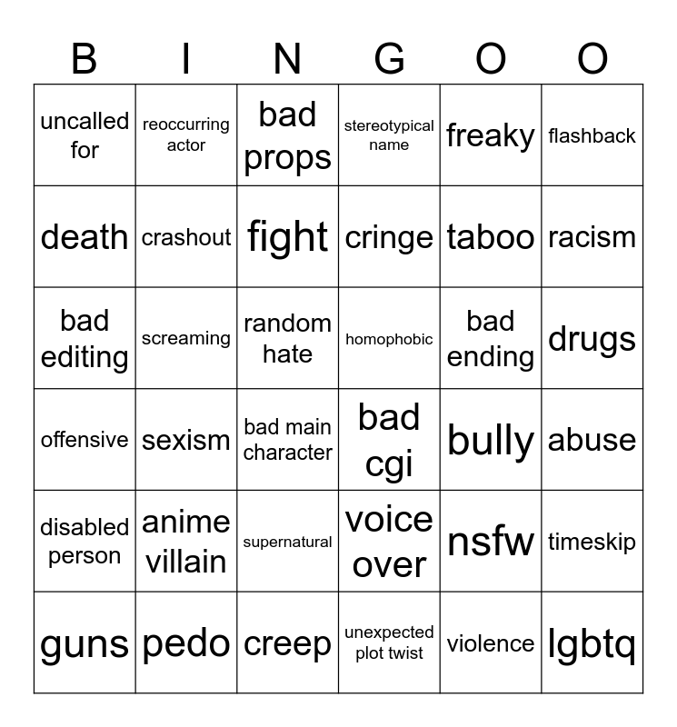 This bingo card has 36 words: voice over, supernatural, unexpected plot twist, death, offensive, homophobic, crashout, creep, freaky, nsfw, racism, stereotypical name, timeskip, screaming, cringe, uncalled for, disabled person, bad ending, bad editing, bad props, random hate, sexism, bad cgi, bad main character, bully, reoccurring actor, taboo, pedo, fight, flashback, lgbtq, guns, abuse, drugs, anime villain and violence.