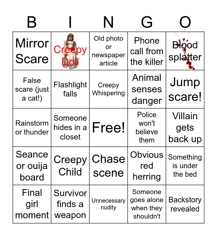 This bingo card has 2 images, a free space and 24 words: Final girl moment, Creepy Child, Creepy Whispering, Someone goes alone when they shouldn't, Blood splatter, Mirror Scare, Creepy Doll, Old photo or newspaper article, Police won't believe them, Villain gets back up, Rainstorm or thunder, Flashlight falls, Obvious red herring, Something is under the bed, False scare (just a cat!), Survivor finds a weapon, Unnecessary nudity, Phone call from the killer, Jump scare!, Seance or ouija board, Someone hides in a closet, Chase scene, Animal senses danger and Backstory revealed.
