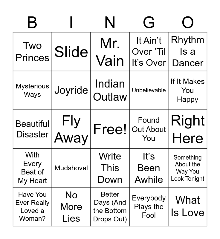 This bingo card has a free space and 60 words: Step by Step, No More Lies, C’mon and Get My Love, With Every Beat of My Heart, Everybody Plays the Fool, I Like the Way, Joyride, Something to Talk About, Unbelievable, Signs, It Ain’t Over ’Til It’s Over, Friday I’m in Love, Mysterious Ways, Good for Me, Make It Happen, Two Princes, What Is Love, Rhythm Is a Dancer, More and More, Indian Outlaw, Found Out About You, Mr. Vain, Have You Ever Really Loved a Woman?, Something About the Way You Look Tonight, You Were Meant for Me, Quit Playing Games (With My Heart), Barely Breathing, I Want You, If It Makes You Happy, Love Gets Me Every Time, I’m Holdin’ On to Love (To Save My Life), Come On Over, Believe, Don’t Turn Around, Slide, I Want It That Way, Save Tonight, Fly Away, Someday, Beautiful Disaster, Miami, Mudshovel, Right Here, So Far Away, It’s Been Awhile, What It’s Like, How Forever Feels, Sometimes, Lesson in Leavin’, Write This Down, Better Days (And the Bottom Drops Out), Machinehead, Glycerine, Fell on Black Days, Black Hole Sun, Privilege, Me in Honey, Seven, Summertime and Bleed to Love Her.