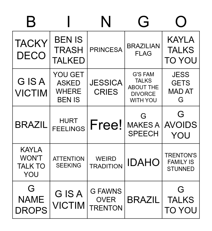 This bingo card has a free space and 29 words: G NAME DROPS, THERE IS A FIGHT, HURT FEELINGS, G WON'T MAKE EYE CONTACT WITH YOU, TACKY DECO, PRINCESA, YOU GET ASKED WHERE BEN IS, ATTENTION SEEKING, G MAKES A SPEECH, G IS A VICTIM, G AVOIDS YOU, G TALKS TO YOU, G FAWNS OVER TRENTON, BRAZIL, JESS GETS MAD AT G, KAYLA IS AKWARD, WEIRD TRADITION, KAYLA WON'T TALK TO YOU, KAYLA TALKS TO YOU, BRAZIL, IDAHO, G'S FAM IS GREAT TO YOU, G'S FAM TALKS ABOUT THE DIVORCE WITH YOU, G IS A VICTIM, BRAZILIAN FLAG, BEN IS TRASH TALKED, TRENTON'S FAMILY IS STUNNED, JESSICA CRIES and GRAMMY LEAVES EARLY.