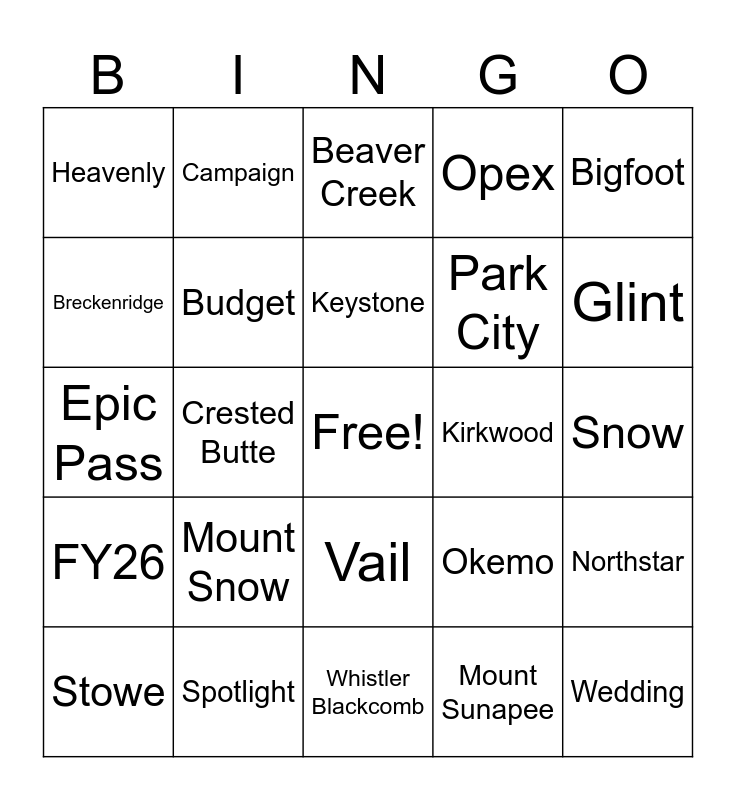 This bingo card has a free space and 24 words: Mount Snow, Spotlight, Keystone, Stowe, Bigfoot, Heavenly, Breckenridge, Campaign, Kirkwood, Vail, Park City, Epic Pass, Okemo, Northstar, Budget, Mount Sunapee, Snow, Beaver Creek, Glint, Crested Butte, Wedding, FY26, Opex and Whistler Blackcomb.