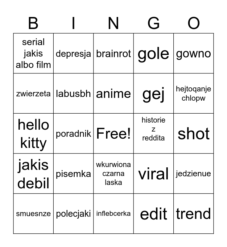 This bingo card has a free space and 24 words: smuesnze, pisemka, anime, edit, gowno, serial jakis albo film, depresja, brainrot, historie z reddita, shot, hello kitty, labusbh, viral, jedzienue, zwierzeta, polecjaki, inflebcerka, gole, hejtoqanje chlopw, jakis debil, poradnik, wkurwiona czarna laska, gej and trend.