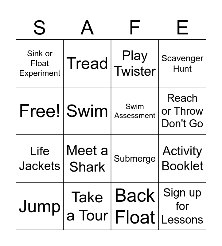 This bingo card has 16 words: Take a Tour, Activity Booklet, Play Twister, Sink or Float Experiment, Life Jackets, Tread, Submerge, Back Float, Free!, Swim, Jump, Scavenger Hunt, Meet a Shark, Reach or Throw Don't Go, Swim Assessment and Sign up for Lessons.