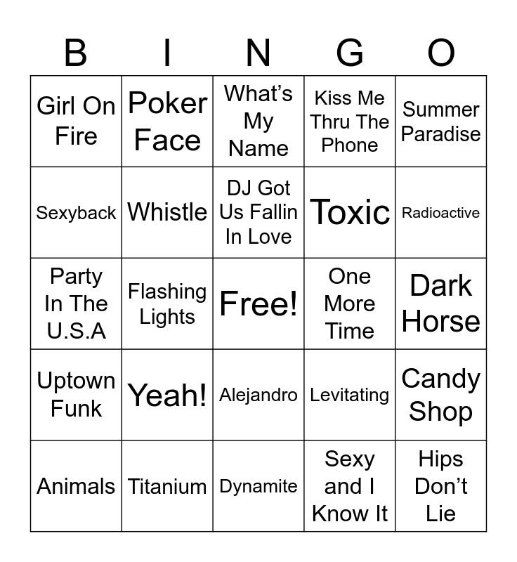 This bingo card has a free space and 49 words: Low, Hips Don’t Lie, TiK ToK, Dynamite, Yeah!, Just Dance, Poker Face, ..Baby One More Time, Sexyback, Call Me Maybe, Whistle, Kiss Me Thru The Phone, Candy Shop, Levitating, Payphone, We Are Young, DJ Got Us Fallin In Love, One More Time, Roar, Summer Paradise, Flashing Lights, Sexy and I Know It, Girl On Fire, Toxic, In The End, Radioactive, Animals, Waka Waka, Alejandro, Uptown Funk, Firework, Glad You Came, Locked Out Of Heaven, Cheerleader, Titanium, Timber, Wild Ones, Time Of Our Lives, Dark Horse, Pumped Up Kicks, The Lazy Song, Die Young, Don’t Stop The Music, Bad Romance, Party In The U.S.A, What’s My Name, Party Rock Anthem, Move Like Jagger and In Da Club.