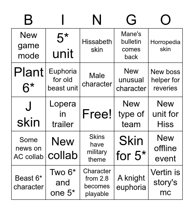 This bingo card has a free space and 24 words: Beast 6* character, New collab, Male character, A knight euphoria, Horropedia skin, New game mode, 5* unit, Hissabeth skin, New type of team, New unit for Hiss, J skin, Euphoria for old beast unit, Skin for 5*, New offline event, Plant 6*, Two 6* and one 5*, Character from 2.8 becomes playable, Mane's bulletin comes back, New boss helper for reveries, Some news on AC collab, Lopera in trailer, Skins have military theme, New unusual character and Vertin is story's mc.