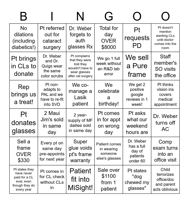 This bingo card has 36 words: Patient comes in wearing someone else's glasses, Super glue voids pt's frame warranty, Sale over $1100 from 1 patient, Pt brings in CLs to donate, Pt donates glasses, We celebrate a birthday!, Dr. Weber and Dr. Quigs wear the same color scrubs, Patient fit into MiSight!, Pt requests PD, Dr. Weber has a full day of patients under 60, Staff member's SO visits the office, Total for day OVER $8000, Comp exam turns into an office visit, Pt non-adapts to PAL and we have to re-fit into SVD, We go 1 full week without an R&D lab error, No dilations (including diabetics!), Sell a frame OVER $330, We get 2 positive google reviews in 1 week!, Rep brings us a treat!, Dr. Weber forgets to auth glasses Rx, We co-manage a Lasik patient, 2 Maui Jim's sold in same day, Pt comes in for appt on wrong day, 2 year-supply of MF dailies sold in same day, Pt asks what our weekend hours are, Pt referred out for cataract surgery, We sell a Pure frame, Pt comes in for CL check without CLs in, Pt complains that they were told they wouldn't have to wear glasses after cat surgery, Pt doesn't mention wanting CLs until doctor comes into the room, Child terrorizes office/doc and parent acts oblivious, Pt states they have never paid for a CL eval, even though they do every year, Dr. Weber turns off AC, Pt thinks vision ins covers medical appointment, Every pt on same day pre-appoints for next year and Pt states "dog chewed my glasses".