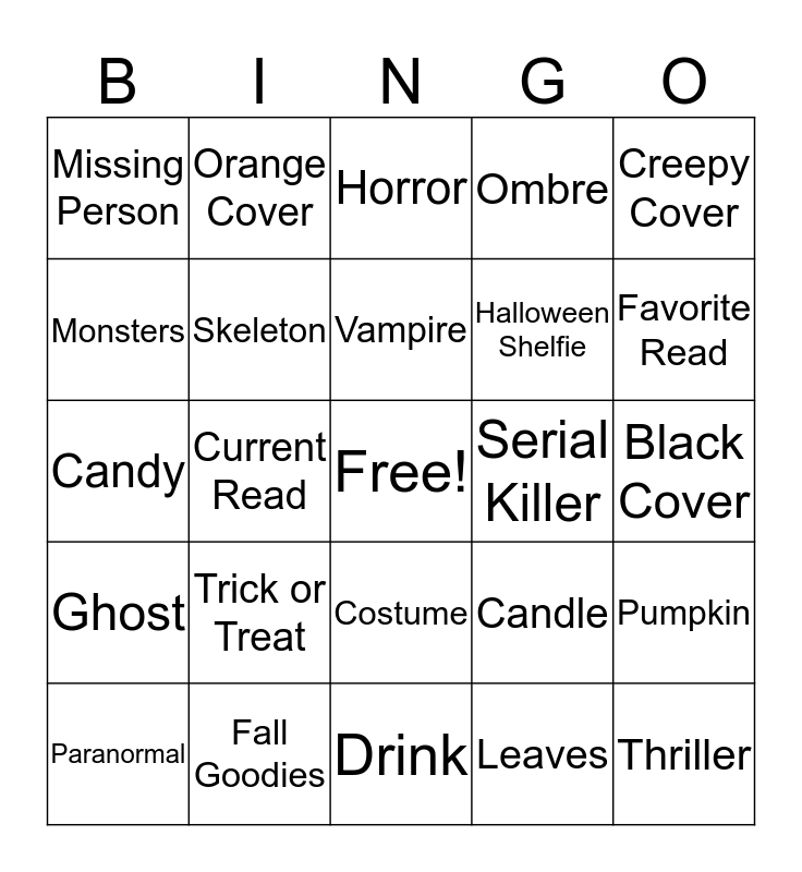 This bingo card has a free space and 24 words: Trick or Treat, Fall Goodies, Vampire, Paranormal, Creepy Cover, Missing Person, Monsters, Orange Cover, Serial Killer, Costume, Halloween Shelfie, Candy, Candle, Pumpkin, Skeleton, Leaves, Black Cover, Horror, Favorite Read, Current Read, Thriller, Ghost, Ombre and Drink.