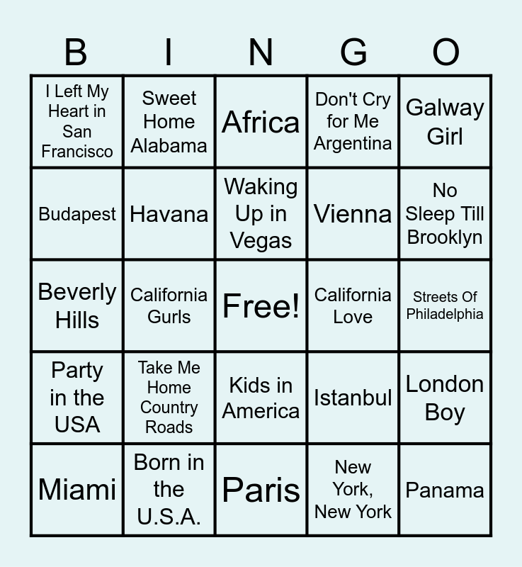 This bingo card has a free space and 32 words: New York, New York, Empire State of Mind, California Gurls, Welcome to New York, Party in the USA, Havana, Galway Girl, London Boy, Sweet Home Alabama, Viva Las Vegas, Waking Up in Vegas, Africa, Old Town Road, South of the Border, California Love, Devil Went Down to Georgia, Miami, Beverly Hills, Kids in America, Take Me Home Country Roads, Istanbul, London Calling, Streets Of Philadelphia, Born in the U.S.A., Panama, Don't Cry for Me Argentina, Vienna, Budapest, I Left My Heart in San Francisco, Paris, Rio and No Sleep Till Brooklyn.
