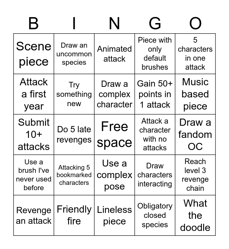 This bingo card has a free space and 24 words: Attacking 5 bookmarked characters, Friendly fire, Draw a complex character, Revenge an attack, 5 characters in one attack, Scene piece, Attack a first year, Draw an uncommon species, Attack a character with no attacks, Use a complex pose, Gain 50+ points in 1 attack, Submit 10+ attacks, Draw characters interacting, Reach level 3 revenge chain, Try something new, Obligatory closed species, Draw a fandom OC, Animated attack, Music based piece, Do 5 late revenges, What the doodle, Use a brush I've never used before, Piece with only default brushes and Lineless piece.