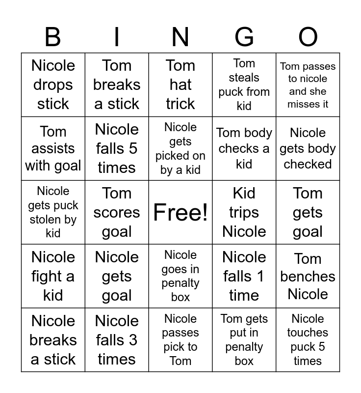 This bingo card has a free space and 24 words: Nicole gets goal, Nicole falls 3 times, Nicole gets picked on by a kid, Nicole breaks a stick, Tom passes to nicole and she misses it, Nicole drops stick, Tom assists with goal, Tom breaks a stick, Kid trips Nicole, Nicole goes in penalty box, Tom body checks a kid, Nicole gets puck stolen by kid, Nicole falls 1 time, Tom benches Nicole, Nicole falls 5 times, Tom gets put in penalty box, Tom gets goal, Tom hat trick, Nicole gets body checked, Tom scores goal, Nicole touches puck 5 times, Nicole fight a kid, Tom steals puck from kid and Nicole passes pick to Tom.