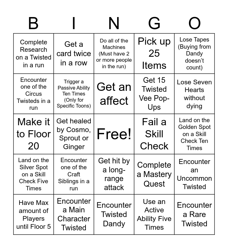 This bingo card has a free space and 24 words: Encounter one of the Craft Siblings in a run, Encounter a Main Character Twisted, Get an affect, Have Max amount of Players until Floor 5, Lose Tapes (Buying from Dandy doesn’t count), Complete Research on a Twisted in a run, Encounter one of the Circus Twisteds in a run, Get a card twice in a row, Fail a Skill Check, Get hit by a long-range attack, Get 15 Twisted Vee Pop-Ups, Make it to Floor 20, Complete a Mastery Quest, Encounter an Uncommon Twisted, Trigger a Passive Ability Ten Times (Only for Specific Toons), Use an Active Ability Five Times, Land on the Golden Spot on a Skill Check Ten Times, Do all of the Machines (Must have 2 or more people in the run), Lose Seven Hearts without dying, Get healed by Cosmo, Sprout or Ginger, Encounter a Rare Twisted, Land on the Silver Spot on a Skill Check Five Times, Pick up 25 Items and Encounter Twisted Dandy.