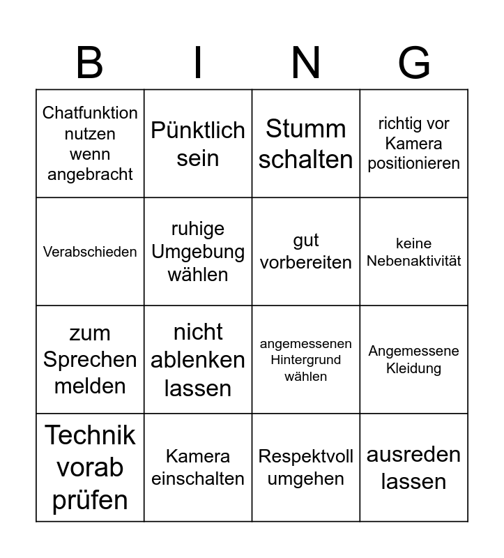 This bingo card has 16 words: Kamera einschalten, Angemessene Kleidung, Stumm schalten, Chatfunktion nutzen wenn angebracht, zum Sprechen melden, Pünktlich sein, angemessenen Hintergrund wählen, Respektvoll umgehen, Verabschieden, ruhige Umgebung wählen, Technik vorab prüfen, richtig vor Kamera positionieren, nicht ablenken lassen, keine Nebenaktivität, gut vorbereiten and ausreden lassen.