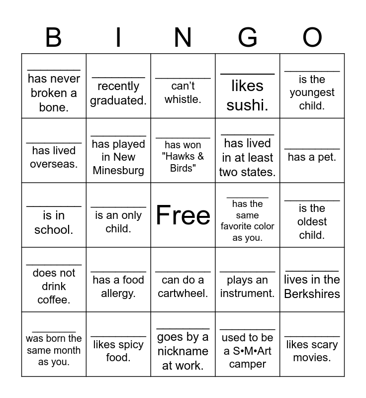 This bingo card has a free space and 29 words: ________ was born the same month as you., ________ has been with Flying Cloud for less than one year., _________ is an only child., _________ likes to sing., ________ has never broken a bone., _________ can’t whistle., _________ has played in New Minesburg, _________ has a food allergy., ________ has the same favorite color as you., _________ likes spicy food., _________ is the oldest child., _________ likes scary movies., ________ goes by a nickname at work., _________ used to be a S•M•Art camper, _________ has a pet., ________ can speak another language., _________ can do a cartwheel., _________ does not drink coffee., _________ is the youngest child., ________ is in school., _________ plays an instrument., ________ is afraid of birds., ________ has lived in at least two states., _________ has lived overseas., ______ likes sushi., ________ recently graduated., ________ lives in the Berkshires, __________ has won "Hawks & Birds" and ___________ is a friend of Bob. iykyk.