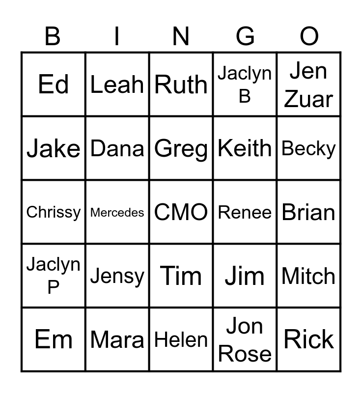 This bingo card has a free space and 24 words: Jensy, Mara, Greg, Em, Jen Zuar, Ed, Jake, Leah, Renee, Tim, Keith, Chrissy, Jim, Mitch, Dana, Jon Rose, Brian, Ruth, Becky, Mercedes, Rick, Jaclyn P, Jaclyn B and Helen.