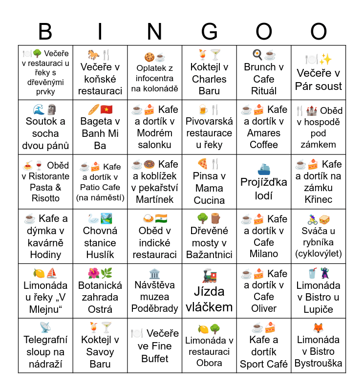 This bingo card has 36 words: 🚂 Jízda vláčkem, 🏛️ Návštěva muzea Poděbrady, 🍋🌳 Limonáda v restauraci Obora, 🌊🗿 Soutok a socha dvou pánů, ☕ Kafe a dýmka v kavárně Hodiny, 🍕🍴 Pinsa v Mama Cucina, 🥖🇻🇳 Bageta v Banh Mi Ba, 🍽️ Večeře ve Fine Buffet, 🍳☕ Brunch v Cafe Rituál, ☕🍰 Kafe a dortík v Cafe Oliver, 🍴🏰 Oběd v hospodě pod zámkem, 🍹🍸 Koktejl v Charles Baru, 🥤🦹♂️ Limonáda v Bistro u Lupiče, ☕🍰 Kafe a dortík v Patio Cafe (na náměstí), 🍺🍴 Pivovarská restaurace u řeky, 🍽️🌳 Večeře v restauraci u řeky s dřevěnými prvky, 🍋⛵ Limonáda u řeky „V Mlejnu“, ⛴️ Projížďka lodí, 🍝🍷 Oběd v Ristorante Pasta & Risotto, 🍪☕ Oplatek z infocentra na kolonádě, ☕🍩 Kafe a koblížek v pekařství Martínek, 🦢🏞️ Chovná stanice Huslík, 🌳🪵 Dřevěné mosty v Bažantnici, 🍛🇮🇳 Oběd v indické restauraci, ☕🍰 Kafe a dortík v Cafe Milano, 🐎🍴 Večeře v koňské restauraci, ☕🍰 Kafe a dortík v Amares Coffee, 🍹🍸 Koktejl v Savoy Baru, ☕🍰 Kafe a dortík v Modrém salonku, 🍽️✨ Večeře v Pár soust, 🦊 Limonáda v Bistro Bystrouška, 📡 Telegrafní sloup na nádraží, 🚴♀️🥪 Sváča u rybníka (cyklovýlet), ☕🍰 Kafe a dortík na zámku Křinec, 🌺🌿 Botanická zahrada Ostrá and ☕🍰 Kafe a dortík Sport Café.