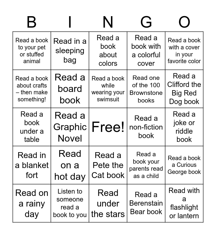This bingo card has a free space and 24 words: Read on a hot day, Listen to someone read a book to you, Read a book while wearing your swimsuit, Read on a rainy day, Read a book with a cover in your favorite color, Read a book to your pet or stuffed animal, Read a book about crafts – then make something!, Read in a sleeping bag, Read a non-fiction book, Read a Pete the Cat book, Read one of the 100 Brownstone books, Read a book under a table, Read a book your parents read as a child, Read a book a Curious George book, Read a board book, Read a Berenstain Bear book, Read a joke or riddle book, Read a book about colors, Read a Clifford the Big Red Dog book, Read a Graphic Novel, Read with a flashlight or lantern, Read in a blanket fort, Read a book with a colorful cover and Read under the stars.