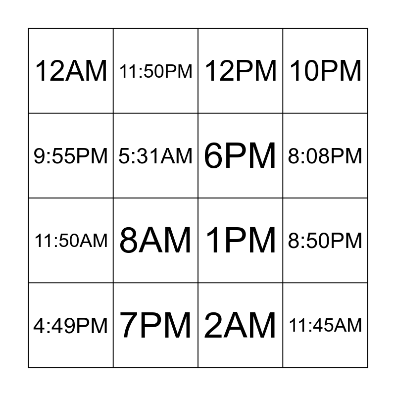 This bingo card has 16 words: 7PM, 8:50PM, 12PM, 12AM, 11:50AM, 11:50PM, 1PM, 2AM, 9:55PM, 5:31AM, 4:49PM, 10PM, 8AM, 8:08PM, 6PM and 11:45AM.
