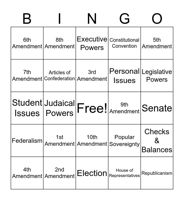 This bingo card has a free space and 24 words: 1st Amendment, 2nd Amendment, 3rd Amendment, 4th Amendment, 5th Amendment, 6th Amendment, 7th Amendment, 8th Amendment, 9th Amendment, 10th Amendment, Personal Issues, Student Issues, Popular Sovereignty, Checks & Balances, Articles of Confederation, House of Representatives, Senate, Executive Powers, Legislative Powers, Judaical Powers, Republicanism, Federalism, Constitutional Convention and Election.