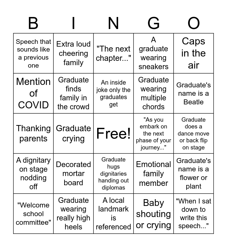 This bingo card has a free space and 24 words: Decorated mortar board, Graduate wearing really high heels, An inside joke only the graduates get, "Welcome school committee", Caps in the air, Speech that sounds like a previous one, Mention of COVID, Extra loud cheering family, "As you embark on the next phase of your journey...", Graduate hugs dignitaries handing out diplomas, Graduate wearing multiple chords, Thanking parents, Emotional family member, Graduate's name is a flower or plant, Graduate finds family in the crowd, Baby shouting or crying, Graduate does a dance move or back flip on stage, "The next chapter...", Graduate's name is a Beatle, Graduate crying, "When I sat down to write this speech...", A dignitary on stage nodding off, A graduate wearing sneakers and A local landmark is referenced.