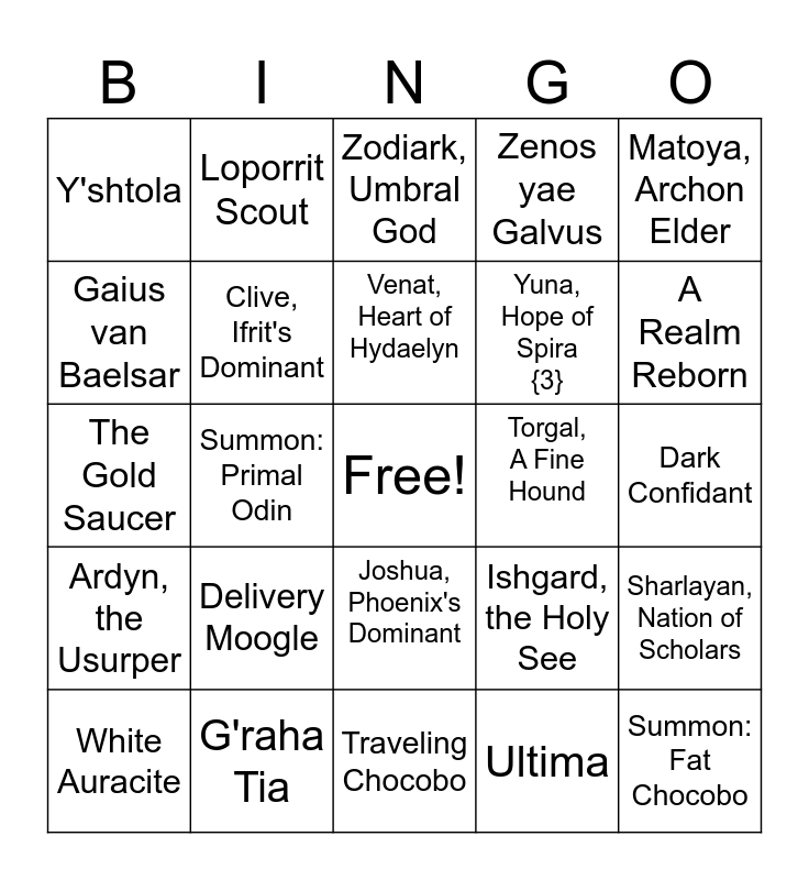 This bingo card has a free space and 24 words: Delivery Moogle, G'raha Tia, Venat, Heart of Hydaelyn, White Auracite, Matoya, Archon Elder, Y'shtola, Gaius van Baelsar, Loporrit Scout, Torgal, A Fine Hound, Joshua, Phoenix's Dominant, Yuna, Hope of Spira {3}, The Gold Saucer, Ishgard, the Holy See, Sharlayan, Nation of Scholars, Clive, Ifrit's Dominant, Ultima, Dark Confidant, Zodiark, Umbral God, A Realm Reborn, Summon: Primal Odin, Summon: Fat Chocobo, Ardyn, the Usurper, Zenos yae Galvus and Traveling Chocobo.