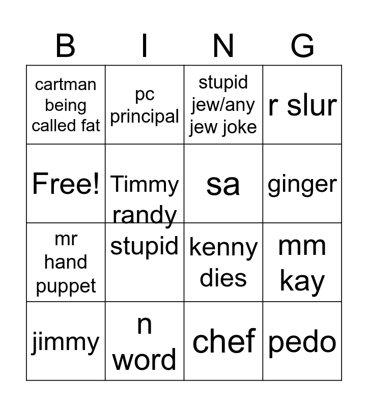 This bingo card has 16 words: n word, mm kay, stupid jew/any jew joke, cartman being called fat, mr hand puppet, pc principal, kenny dies, chef, Free!, Timmy, jimmy, r slur, randy stupid, ginger, sa and pedo.