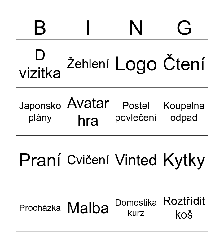 This bingo card has 16 words: Malba, Kytky, Logo, D vizitka, Praní, Žehlení, Vinted, Domestika kurz, Japonsko plány, Avatar hra, Procházka, Čtení, Cvičení, Koupelna odpad, Postel povlečení and Roztřídit koš.