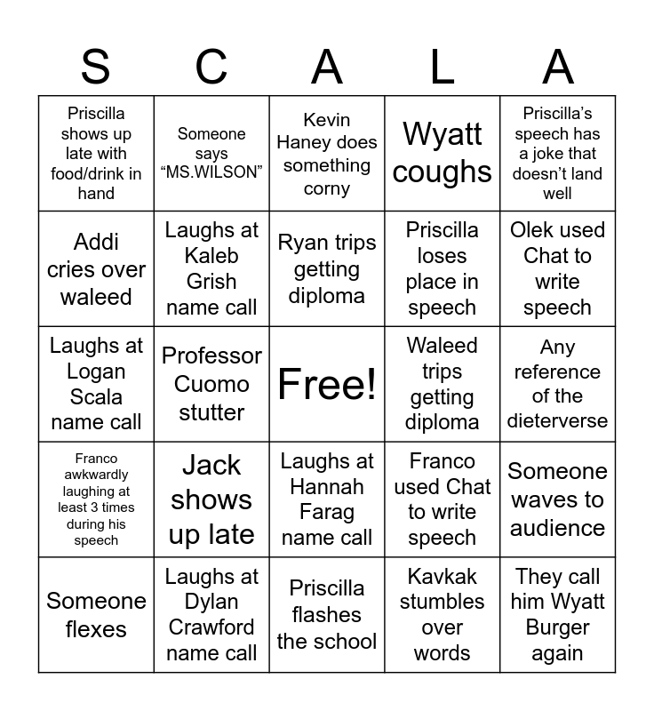 This bingo card has a free space and 40 words: Laughs at Thomas Polito name call, Laughs at Logan Scala name call, Laughs at Felix Dietermann name call, Laughs at Kaleb Grish name call, Laughs at Dylan Crawford name call, Laughs at Hannah Farag name call, Ryan trips getting diploma, Olek mentioning the boys, Priscilla’s speech has a joke that doesn’t land well, Franco awkwardly laughing at least 3 times during his speech, Professor Cuomo stutter, Wyatt coughs, They call him Wyatt Burger again, Any reference of the dieterverse, Waleed trips getting diploma, Jack shows up late, Olek is asked to speak up, Priscilla shows up late with food/drink in hand, Damien is at graduation, Kevin Haney does something corny, Someone waves to audience, Kavkak stumbles over words, Priscilla loses place in speech, Addi cries over waleed, Addi hugs over 12.5 peers, AC wears black pants, Someone wears innappropriate shoes, Cheers when TK’s called, Cheers when Kwame is called, Cheers when Trey is called, Someone’s chords fall off, Someone flexes, Someone backflips, Franco used Chat to write speech, Olek used Chat to write speech, Priscilla flashes the school, Someone falls fully, Kaleb grish is greasy, Someone says “MS.WILSON” and We do not start at 7 pm.