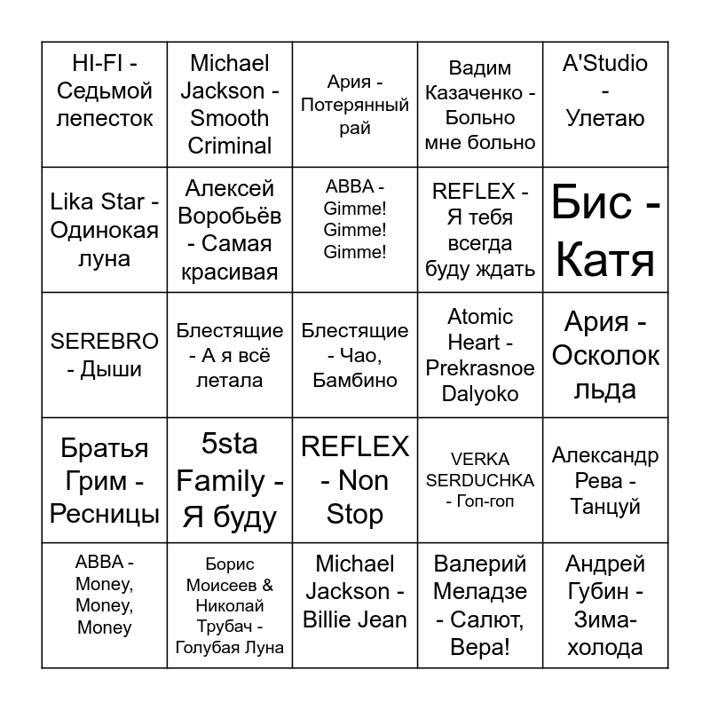 This bingo card has 25 words: 5sta Family - Я буду, Michael Jackson - Billie Jean, ABBA - Gimme! Gimme! Gimme!, ABBA - Money, Money, Money, A'Studio - Улетаю, HI-FI - Седьмой лепесток, Lika Star - Одинокая луна, Michael Jackson - Smooth Criminal, Atomic Heart - Prekrasnoe Dalyoko, REFLEX - Non Stop, REFLEX - Я тебя всегда буду ждать, SEREBRO - Дыши, VERKA SERDUCHKA - Гоп-гоп, Александр Рева - Танцуй, Алексей Воробьёв - Самая красивая, Андрей Губин - Зима-холода, Ария - Осколок льда, Ария - Потерянный рай, Бис - Катя, Блестящие - А я всё летала, Блестящие - Чао, Бамбино, Борис Моисеев & Николай Трубач - Голубая Луна, Братья Грим - Ресницы, Вадим Казаченко - Больно мне больно and Валерий Меладзе - Салют, Вера!.