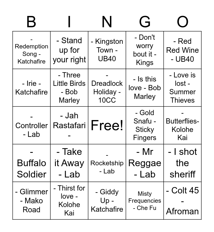 This bingo card has a free space and 32 words: Misty Frequencies - Che Fu, - For the love of it - Salmonella Dub, - Jah Rastafari -, - Praise Jah In the Moonlight, - Buffalo Soldier, - Three Little Birds - Bob Marley, - Red Red Wine - UB40, - I shot the sheriff, - Stand up for your right, - Police in Helicopter, - Dreadlock Holiday - 10CC, - Kingston Town - UB40, - Australia Street - Sticky Fingers, - Caress your soul - Sticky Fingers, - Gold Snafu - Sticky Fingers, - Mysterious Girl - Peter Andre, - Glimmer - Mako Road, - Controller - Lab, - Rocketship - Lab, - Take it Away - Lab, - Mr Reggae - Lab, - Cool Down - Kolohe Kai, - Butterflies- Kolohe Kai, - Thirst for love - Kolohe Kai, - Colt 45 - Afroman, - Don't worry bout it - Kings, - Is this love - Bob Marley, - Irie - Katchafire, - Redemption Song - Katchafire, - Giddy Up - Katchafire, - Coast Roads - Summer Thieves and - Love is lost - Summer Thieves.