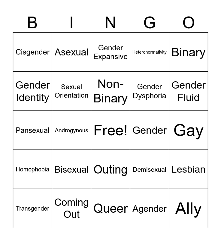 This bingo card has a free space and 24 words: Bisexual, Coming Out, Non-Binary, Transgender, Binary, Cisgender, Gender Identity, Asexual, Gender, Outing, Gender Dysphoria, Pansexual, Demisexual, Lesbian, Sexual Orientation, Agender, Gay, Gender Expansive, Gender Fluid, Androgynous, Ally, Homophobia, Heteronormativity and Queer.