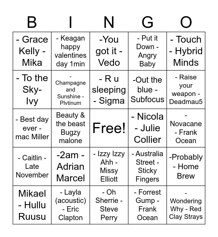 This bingo card has a free space and 29 words: Mikael - Hullu Ruusu, A bar song (tipsy) Shaboozey, Beauty & the beast Bugzy malone, 28 degrees Bhozy, - Grace Kelly - Mika, -You got it - Vedo, - Champagne and Sunshine - Plvtinum, -2am - Adrian Marcel, - Nicola - Julie Collier, - Layla (acoustic) - Eric Clapton, - Novacane - Frank Ocean, - Wondering Why - Red Clay Strays, - Oh Sherrie - Steve Perry, - Forrest Gump - Frank Ocean, - Raise your weapon - Deadmau5, - Cheerleader - Omi, - Izzy Izzy Ahh - Missy Elliott, - Caitlin - Late November, - Touch - Hybrid Minds, - Best day ever - mac Miller, - Australia Street - Sticky Fingers, -Hey Nicky - Nikki S, -Out the blue - Subfocus, - To the Sky- Ivy, - Put it Down - Angry Baby, - Keagan happy valentines day 1min, -Probably - Home Brew, - R u sleeping - Sigma and - One by one - Black Seeds.