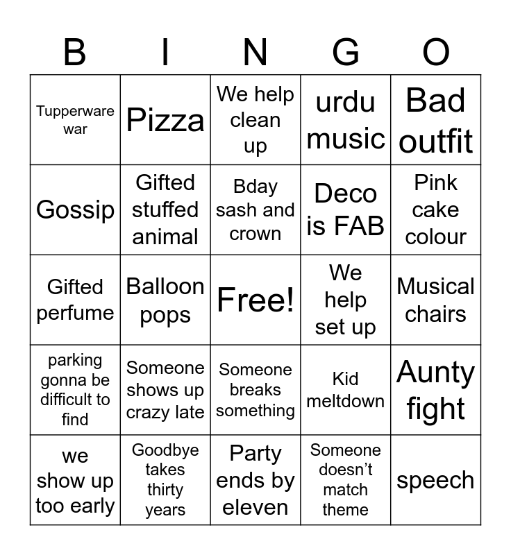 This bingo card has a free space and 24 words: we show up too early, Someone shows up crazy late, Bday sash and crown, Someone doesn’t match theme, Bad outfit, Tupperware war, Pizza, We help clean up, We help set up, Musical chairs, Gifted perfume, Gifted stuffed animal, Kid meltdown, Aunty fight, Gossip, Goodbye takes thirty years, Party ends by eleven, urdu music, Pink cake colour, parking gonna be difficult to find, Balloon pops, Someone breaks something, Deco is FAB and speech.