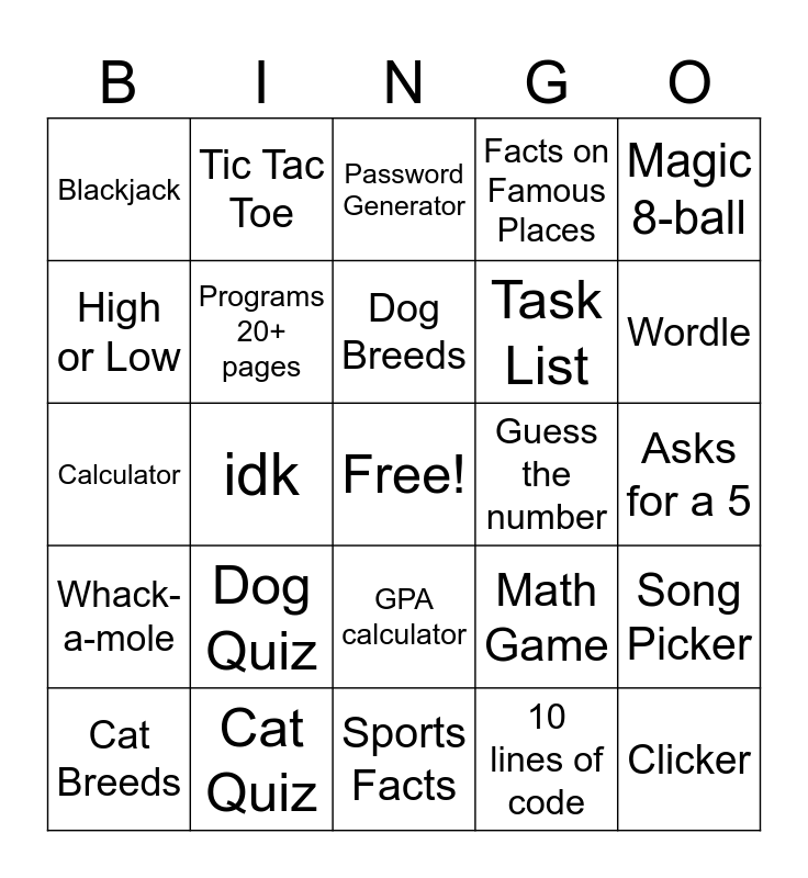 This bingo card has a free space and 24 words: Dog Quiz, Cat Quiz, Dog Breeds, Cat Breeds, Magic 8-ball, Blackjack, High or Low, Tic Tac Toe, Guess the number, GPA calculator, Task List, Calculator, Math Game, Song Picker, Programs 20+ pages, 10 lines of code, Asks for a 5, Password Generator, Wordle, idk, Clicker, Whack-a-mole, Facts on Famous Places and Sports Facts.