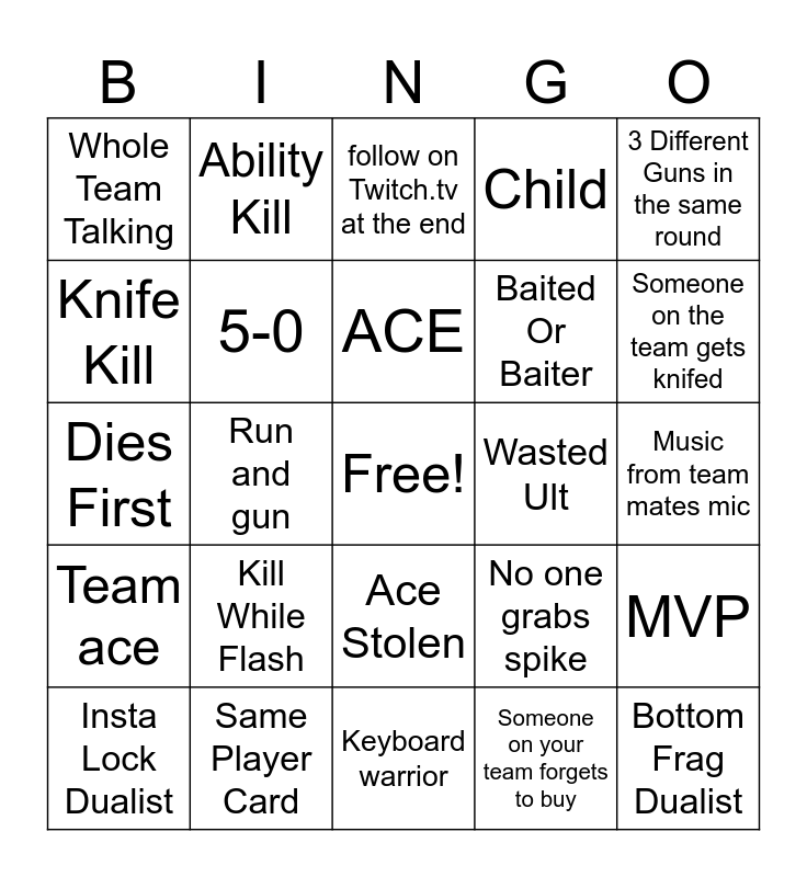 This bingo card has a free space and 24 words: Kill While Flash, Same Player Card, ACE, Insta Lock Dualist, 3 Different Guns in the same round, Whole Team Talking, Knife Kill, Ability Kill, Wasted Ult, Ace Stolen, Baited Or Baiter, Dies First, No one grabs spike, MVP, 5-0, Someone on your team forgets to buy, Music from team mates mic, follow on Twitch.tv at the end, Someone on the team gets knifed, Run and gun, Bottom Frag Dualist, Team ace, Child and Keyboard warrior.