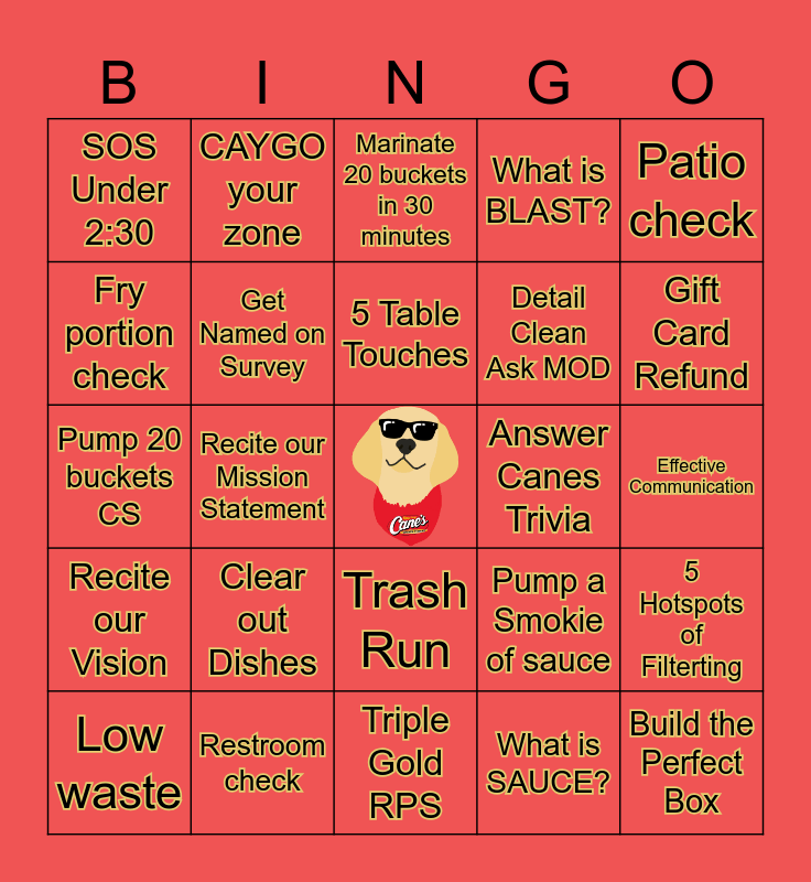 This bingo card has a free space and 24 words: Clear out Dishes, Restroom check, 5 Table Touches, Low waste, Patio check, SOS Under 2:30, Fry portion check, CAYGO your zone, Answer Canes Trivia, Trash Run, Detail Clean Ask MOD, Pump 20 buckets CS, Pump a Smokie of sauce, 5 Hotspots of Filterting, Get Named on Survey, What is SAUCE?, Effective Communication, Marinate 20 buckets in 30 minutes, Gift Card Refund, Recite our Mission Statement, Build the Perfect Box, Recite our Vision, What is BLAST? and Triple Gold RPS.