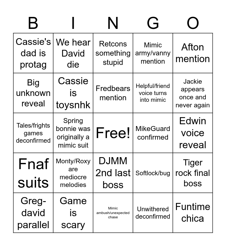 This bingo card has a free space and 24 words: Monty/Roxy are mediocre melodies, Game is scary, Fredbears mention, Greg-david parallel, Afton mention, Cassie's dad is protag, Big unknown reveal, We hear David die, MikeGuard confirmed, DJMM 2nd last boss, Helpful/friend voice turns into mimic, Tales/frights games deconfirmed, Softlock/bug, Tiger rock final boss, Cassie is toysnhk, Unwithered deconfirmed, Edwin voice reveal, Retcons something stupid, Jackie appears once and never again, Spring bonnie was originally a mimic suit, Funtime chica, Fnaf suits, Mimic army/vanny mention and Mimic ambush/unexpected chase.
