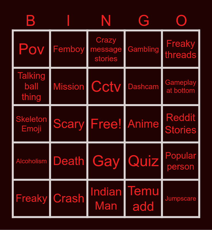 This bingo card has a free space and 24 words: Death, Crash, Cctv, Freaky, Freaky threads, Pov, Talking ball thing, Femboy, Anime, Gay, Dashcam, Skeleton Emoji, Quiz, Popular person, Mission, Temu add, Reddit Stories, Crazy message stories, Gameplay at bottom, Scary, Jumpscare, Alcoholism, Gambling and Indian Man.
